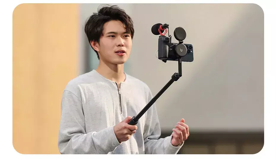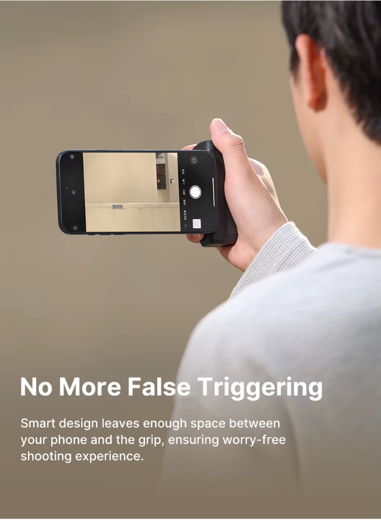 o punho ergonômico antiderrapante se ajusta à sua mão e estabiliza o telefone durante a filmagem.