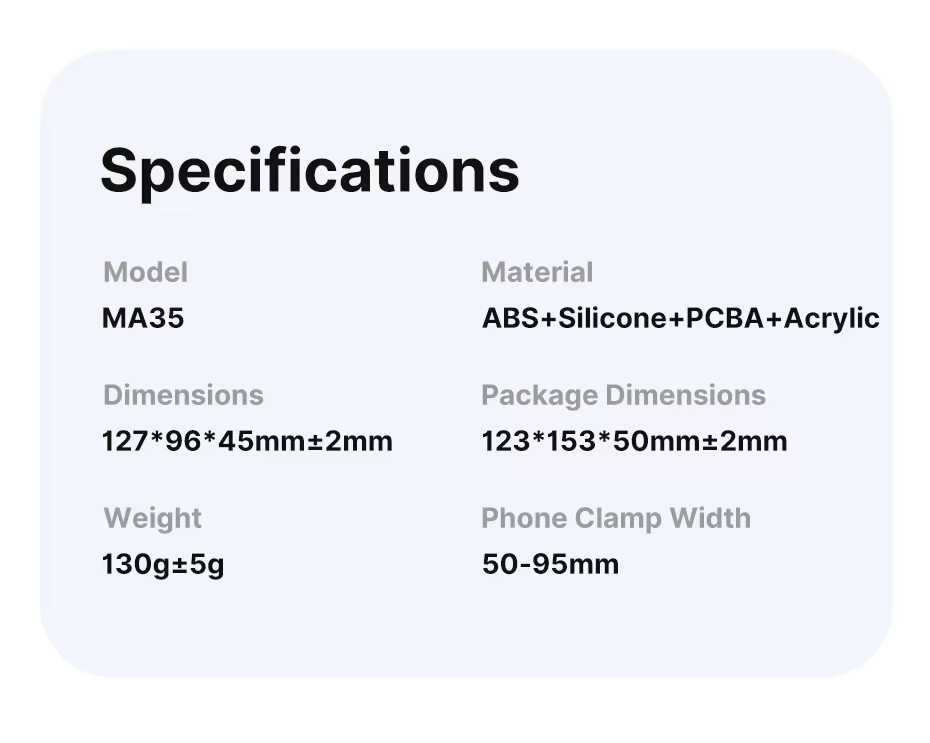 Os acessórios magnéticos MA35 Grip apresentam uma conexão magnética segura que se conecta facilmente, permitindo que você personalize seu fluxo de trabalho em qualquer lugar. Esta conexão perfeita aprimora sua experiência e fornece uma plataforma versátil para seus dispositivos compatíveis com MagSafe. O grampo de telefone se adapta a dispositivos com largura de 1,96 a 3,74”.